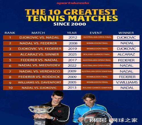 我們再來關(guān)注其它消息。最近,有外媒評選出了21世紀(jì)以來,世界網(wǎng)壇的十佳經(jīng)典對決。在這十場較量中,男子方面的費納德“三巨頭”和新生代領(lǐng)軍人物阿爾卡拉斯、辛納都悉數(shù)上榜;女子方面則只有一場比賽入選。