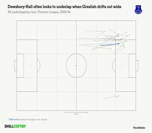 在歐洲五大聯(lián)賽至少出場10次的中場球員中,只有森林隊(duì)的埃利奧特-安德森(31次)的“內(nèi)套插上跑動(dòng)”次數(shù)超過了他的26次。我們可以看到,其中很大一部分是那些從左路內(nèi)套插入禁區(qū)的跑動(dòng)。其中一半是在格拉利什持球時(shí)進(jìn)行的,顯示了兩人的配合頻率。這有助于埃弗頓成為一支更具創(chuàng)造力和變化多端的進(jìn)攻力量。