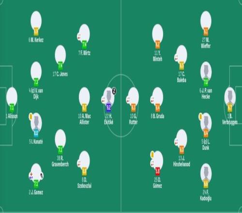 利物浦首發(fā):1-阿利松、2-喬-戈麥斯(26'11-薩拉赫)、4-范戴克、5-科納特、6-科爾克茲、8-索博斯洛伊(83'14-基耶薩)、10-麥卡利斯特、17-瓊斯、38-赫拉芬貝赫、7-維爾茨(78'26-羅伯遜)、22-埃基蒂克(78'9-伊薩克)